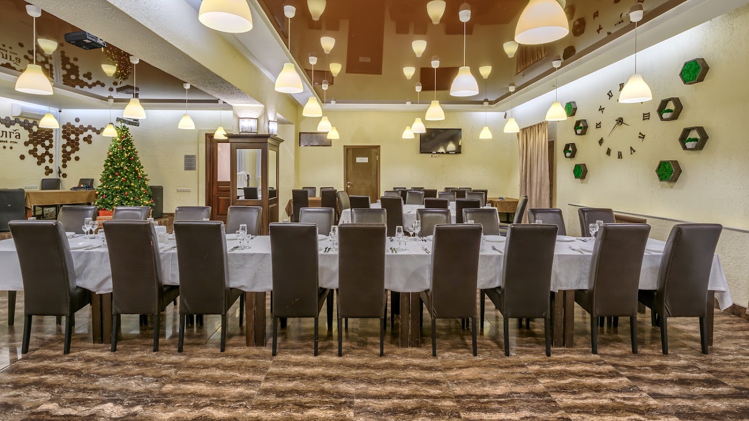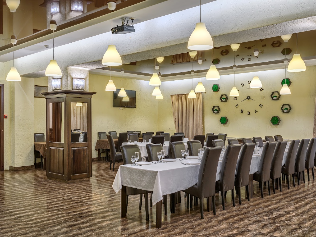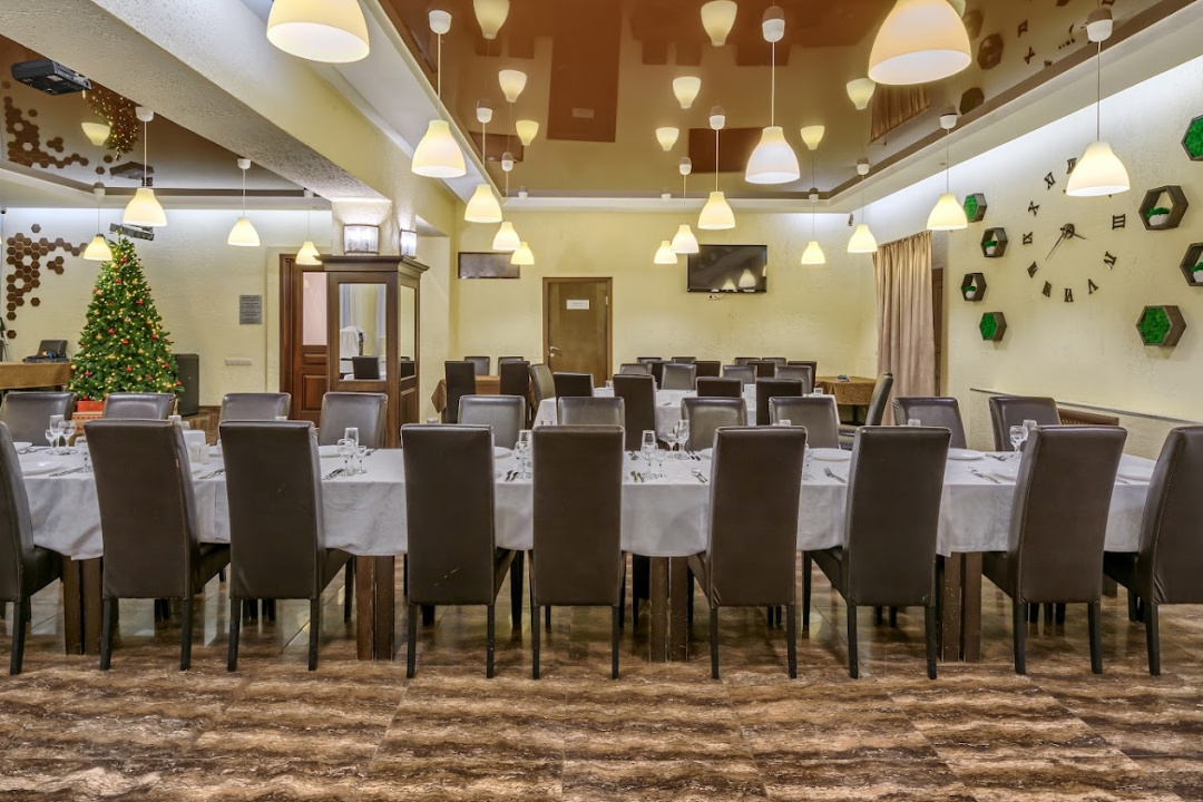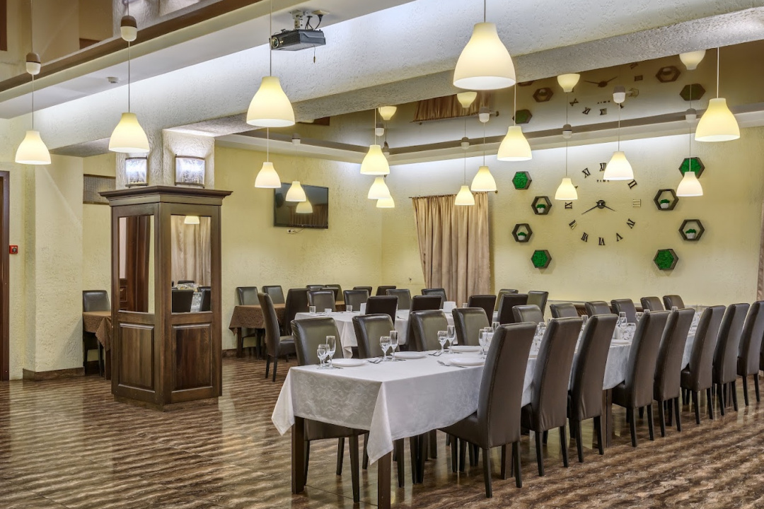 Интерьер ресторана выполнен в элегантном, сдержанном стиле и создает легкую атмосферу. Это идеальное место для проведения свадеб, банкетов и других торжественных мероприятий.