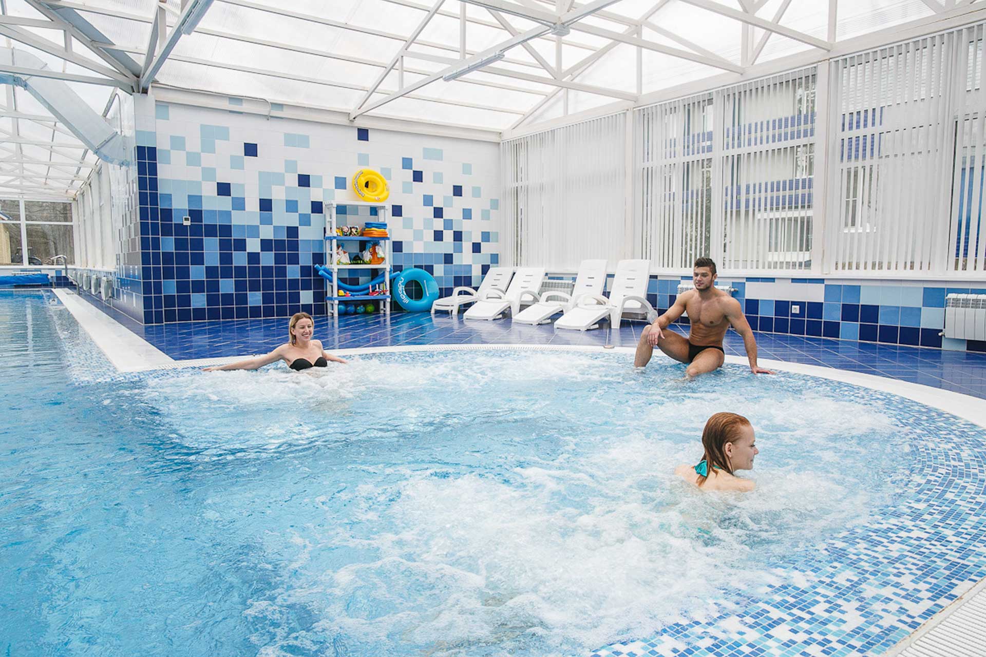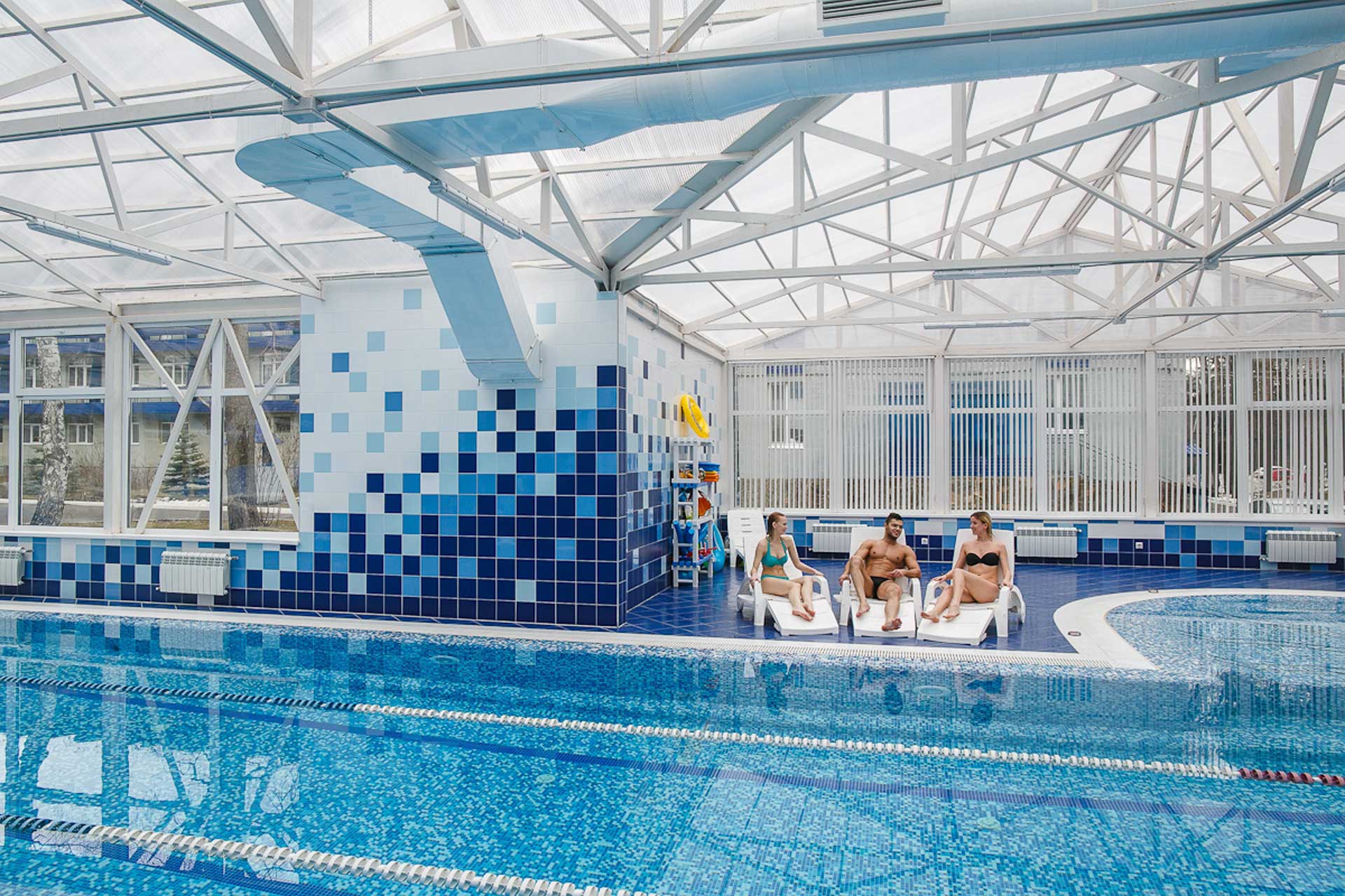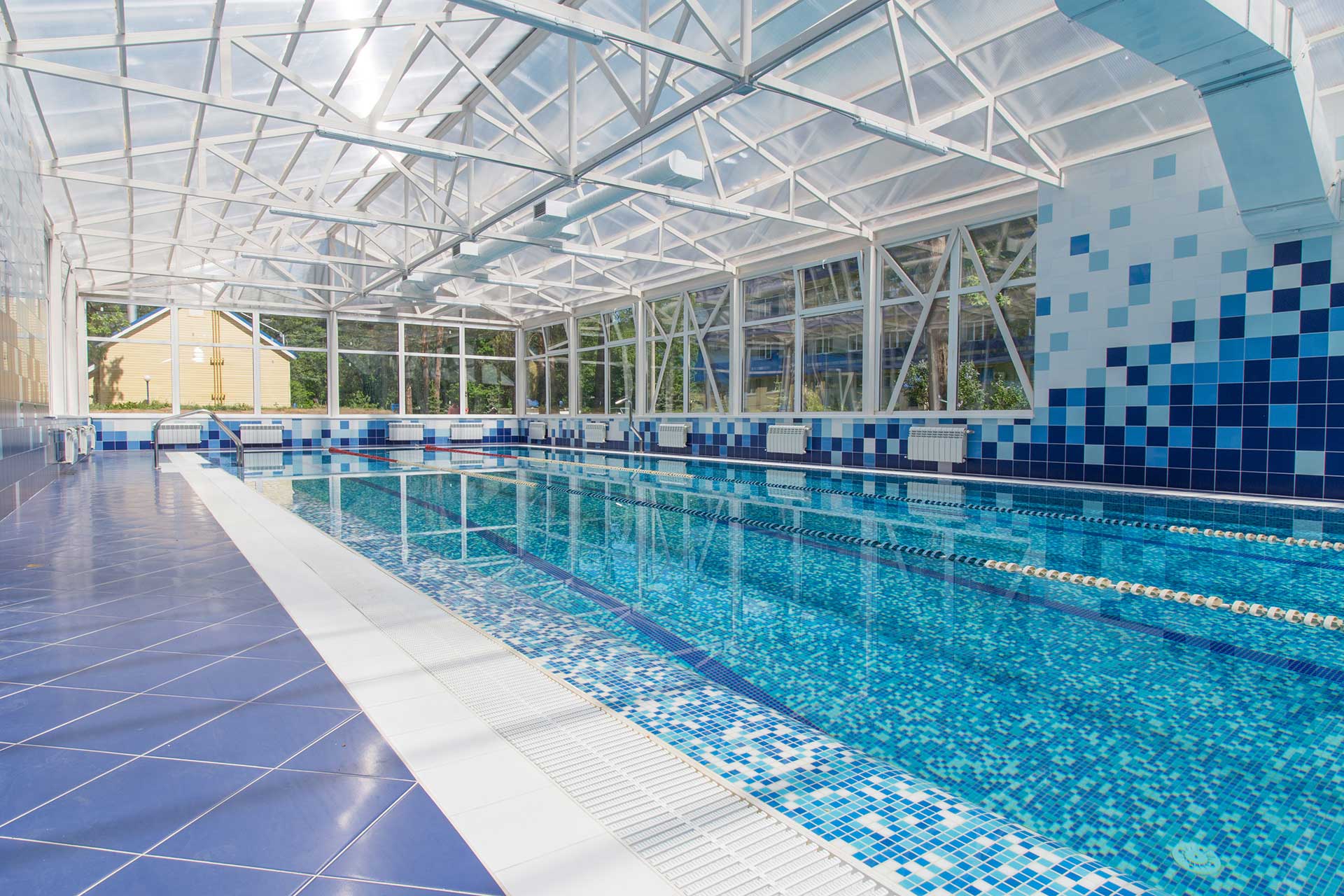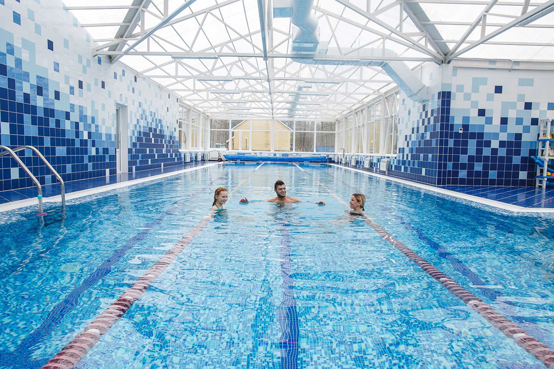 Большие панорамные окна с прекрасным видом и водопадом создают расслабляющую обстановку. Занятия в бассейне успокаивают и укрепляют здоровье.